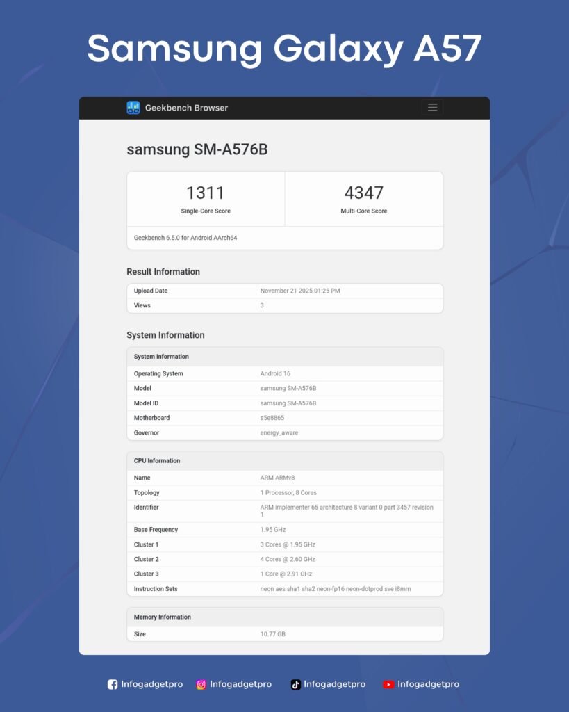 Galaxy A57 juga sudah menjalankan Android 16, menandakan perangkat ini dipersiapkan untuk rilis 2025 dengan dukungan software jangka panjang.