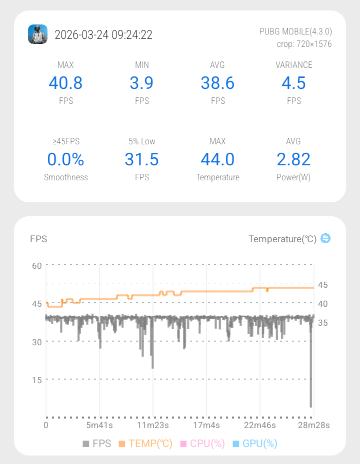 Sementara di PUBG Mobile, setting mentok di Smooth – Ultra dengan rata-rata sekitar 38 fps. Di game ini kelihatan banget batas performanya. Frame drop cukup sering terjadi, apalagi saat banyak objek atau pergerakan cepat, jadi pengalaman mainnya kurang konsisten.