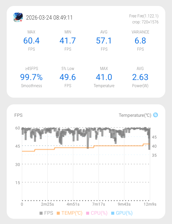 Untuk Free Fire, bisa jalan di setting Max – High dengan fps di kisaran 57 fps. Tapi di sini mulai terasa kurang stabil. Frame drop masih cukup sering muncul, jadi kadang bikin gameplay terasa kurang mulus.