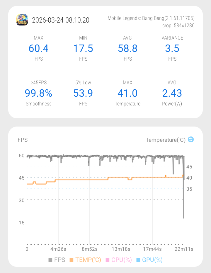 Masuk ke Mobile Legends, setting mentok di Ultra – High dengan rata-rata sekitar 58 fps. Secara keseluruhan masih cukup stabil dan nyaman dimainkan, tapi sesekali masih terasa frame drop kecil, terutama saat war ramai.